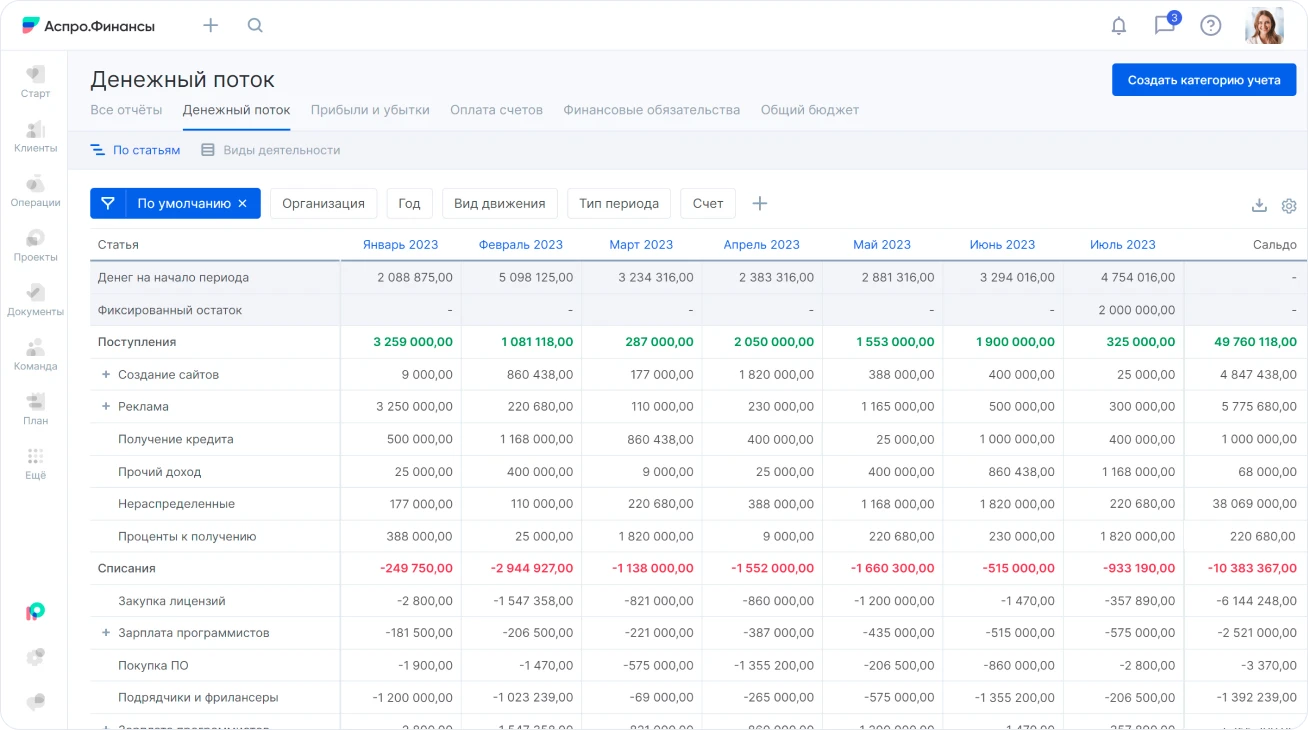 Поступления и выплаты по операционной деятельности. Это ядро вашего бизнеса. Если поступления стабильны и превышают выплаты — это хороший знак, киньте внимание на нестабильные «провалы» и «пики» — когда деньги поступают или уходят очень резко.